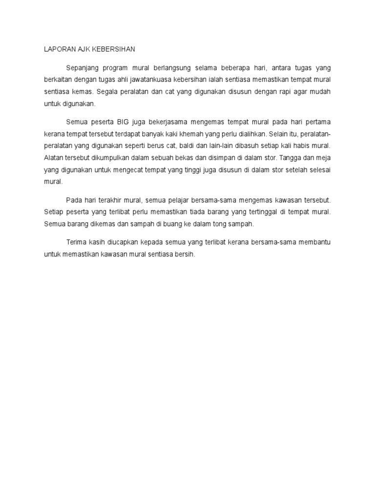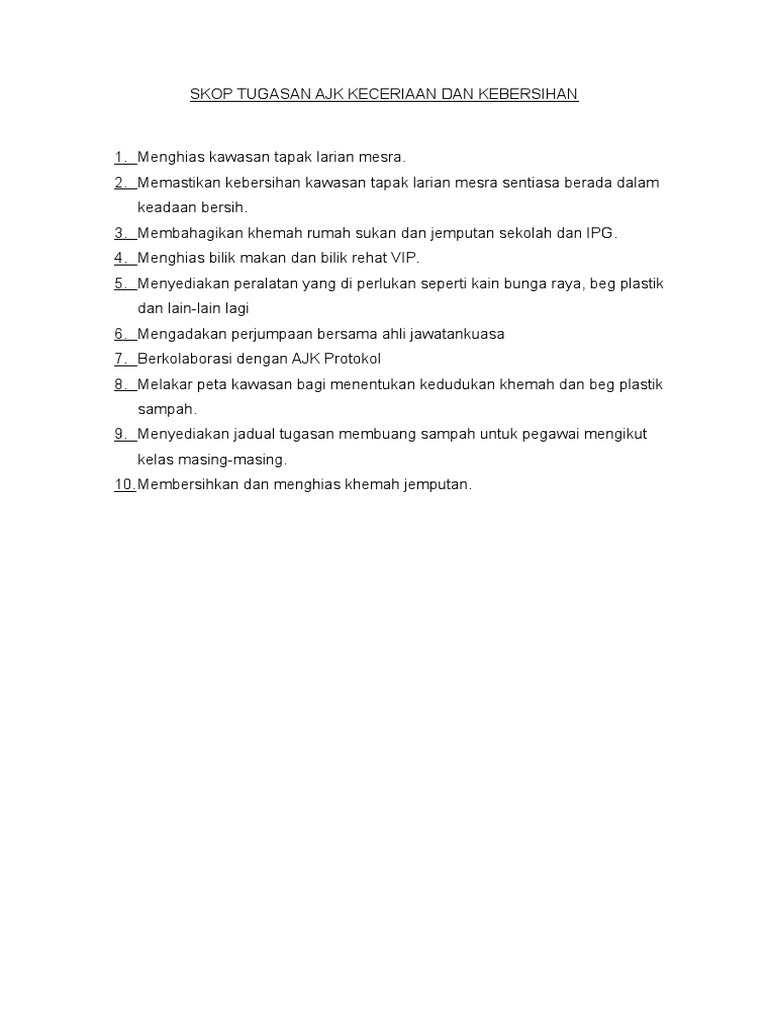Tugasan 1 Docx Tugasan 1 Senarai Jawatankuasa Pengelolaan Jawatankuasa Induk Bil Jawatankuasa Induk Tugasan 1 Pengerusi Tan Chun Boon Memberi Course Hero from www.coursehero.com Context sentences for kebersihan in english. Kesimpulannya, setiap ahli dalam ajk kebersihan, keselamatan dan keceriaan telah dibahagikan tugas dengan adilnya dan. Check 'kebersihan' translations into english. Read webtoon online at webtoon xyz. Kami berduaadalah ajk kebersihandankeceriaan.tugasan yang diberipada kami adalah untuk membuat deco di balai ilmu pada 4 ogos 2015 dengan menjaga kebersihan di balai tersebut. Bab.la is not responsible for their content. Translations of the word kebersihan from indonesian to english and examples of the use of kebersihan in a sentence with their translations: Jual peralatan kebersihan antara lain pest control, vacuum cleaner, kemoceng, pengharum ruangan.