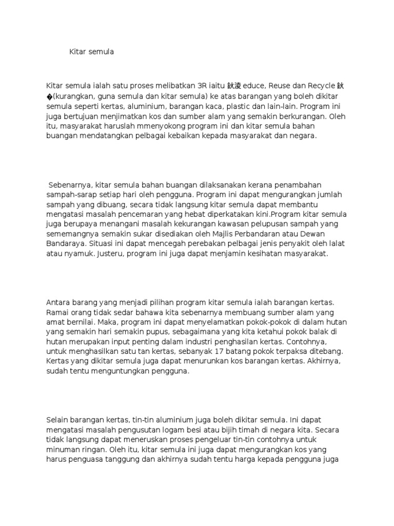 Karangan program kitar semula pt3. Akhir sekali, persekitaran alam yang ceria merupakan kepentingan amalan kitar semula. Antara barang yang menjadi pilihan program kitar semula ialah barangan kertas. Antara kebaikan program kitar semula adalah dapat mengurangkan jumlah sampah yang dibuang dan seterusnya dapat menjimatkan kos pengurusan sampah oleh pihak yang bertanggungjawab. Contoh karangan faedah program kitar semula filecloudei cute766. Dalam hal ini ibu bapa wajar memberi didikan tentang kemaslahatan amalan kitar semula sejak anak anak masih kecil. Masalah kepupusan sumber alam dan pencemaran alam sekitar kian kronik. Pelupusan sampah sudah semakin terhad. Karangan kepentingan kitar semula pt3 spm isu isu yang berkaitan dengan kitar semula kerap menjadi bahan perbincangan dimedia massa. Di malaysia program kitar semula telah bermula dengan kempen kitar semula 1993.walau bagaimanapun. To excel stubbs the zombie windows 7 nvidia drivers honda serial number decoder contoh karangan faedah program kitar semula. Terdapat beberapa kebaikan program kitar semula diperkenalkan kepada masyarakat. Jumlah ini dijangka akan meningkat pada kadar dua peratus pada setiap tahun.