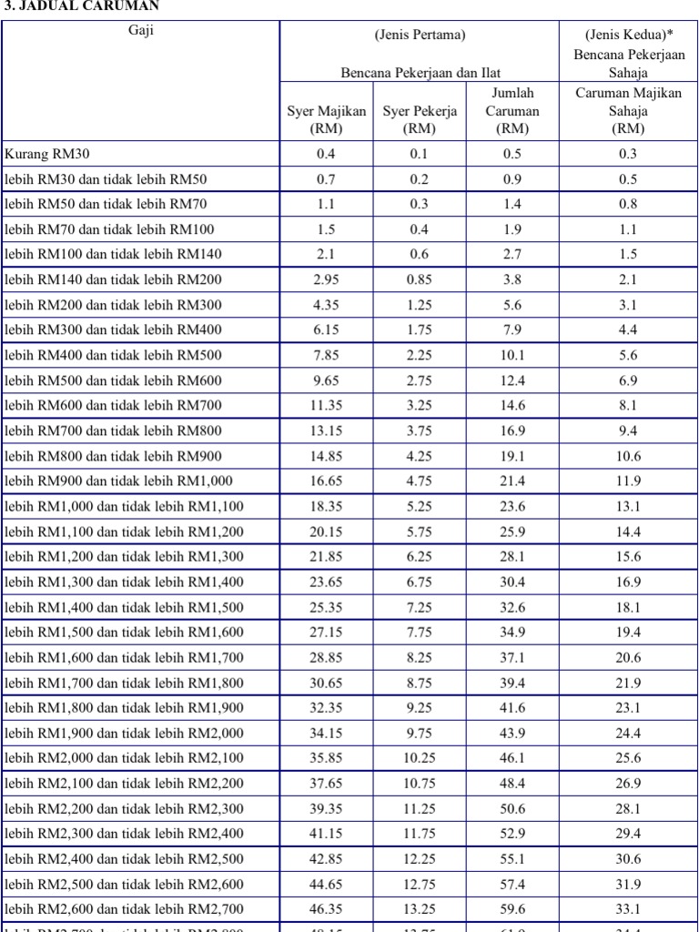 Savesave jadual caruman perkeso for later. Untuk caruman bulan b b 2 0 1 t. Amaun caruman = syer majikan sahaja. Panduan buat anda yang ingin membuat semakan kadar dan jadual caruman sip perkeso tahun 2021. Socso contribution rates & table (jadual caruman socso).