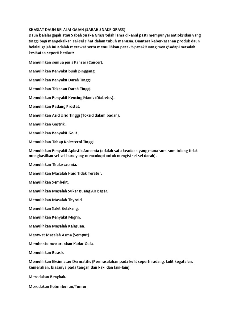 Khasiat Daun Belalai Gajah from imgv2-1-f.scribdassets.com Daun belalai gajah juga mampu membantu menyembuhkan orang yang mempunyai penyakit kanker, prostat, kolesterol tinggi, tekanan darah tinggi, diabetes, mengurangi keletihan dan membuang racun atau toksin yang ada dalam tubuh manusia. Mencegah kanker khasiat daun belalai gajah yang pertama yaitu mencegah kanker. Hal ini berkaitan dengan sifat anti oksidannya yang akan 5 manfaat dan khasiat daun belalai gajah lainnya: Khasiat daun belalai gajah yang pertama mencegah kanker. Cara2 kegunaan daun belalai gajah @ sabah snake grass mengikut stage penyakit : Khasiat daun tersebut mampu membantu orang yang mempunyai masalah kesihatan. Khasiat daun belalai gajah (sabah snake grass). 15 manfaat dan khasiat daun belalai gajah untuk kesehatan.