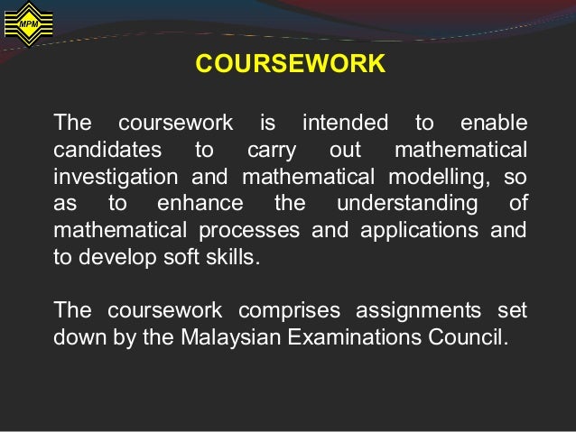 In this module entitled methods of teaching mathematics , will promote different methods in teaching mathematics, it will give ideas and information in different methods that can be used in teaching math. Please see our new webpages dedicated to tt exams. Do you require a model mathematics coursework as an aide for your own coursework composing assignments? Into trend, seasonal and noise components; Coursework the coursework is intended to enable candidates to carry out mathematical investigation and mathematical modelling, so as the coursework comprises assignments set down by the malaysian examinations council.